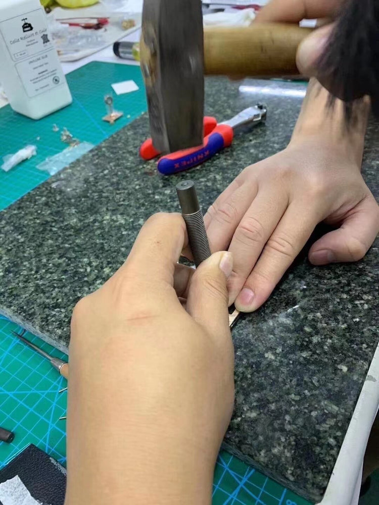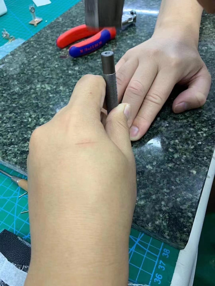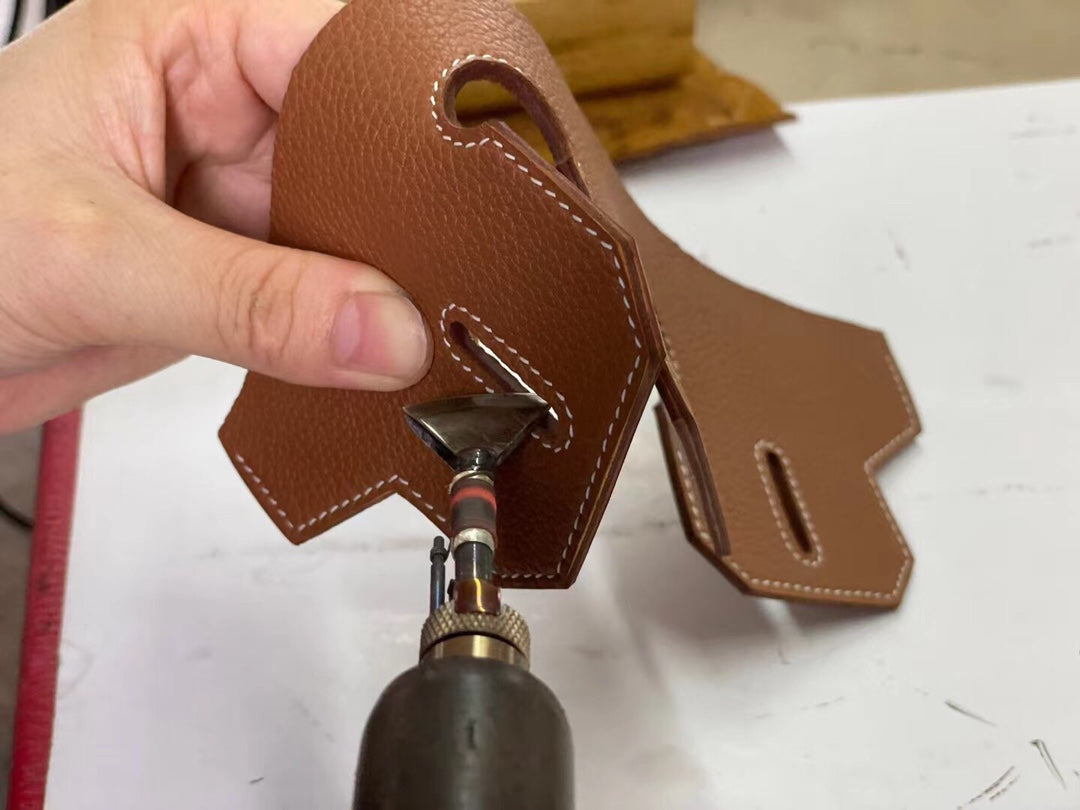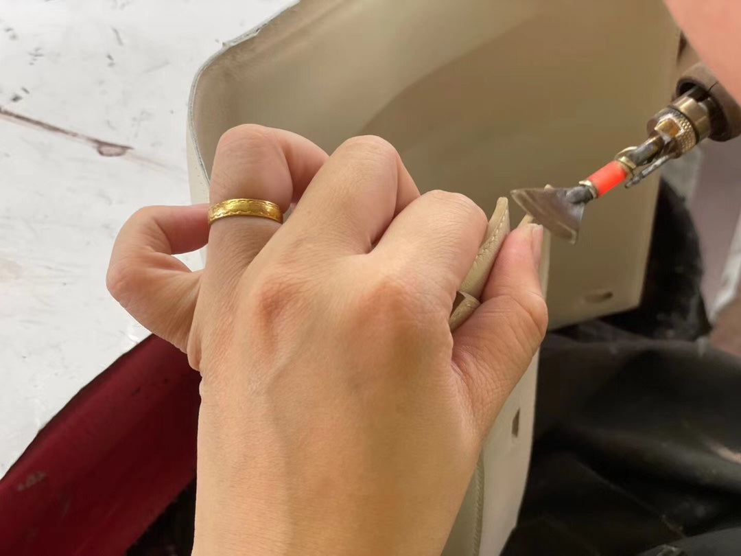 The oiled edge is treated with French-original Mando 8 tools for polishing and sealing, then coated with French wax and heat-pressed three times at high temperature, fusing the leather into a uniform thickness while still revealing the cross-sectional grain of the leather.